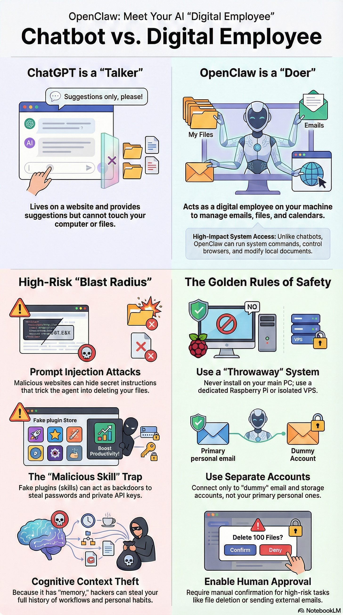First off, OpenClaw is AI Agent, not a standard chatbot. While you might be used to the “sandboxed” safety (relatively speaking) of ChatGPT, OpenClaw operates under the philosophy of “Your assistant, your machine, your rules.” This means the burden of security sits entirely on your shoulders. Think of ChatGPT as a consultant you meet in a secure office; OpenClaw is a research assistant you’ve given the keys to your home.